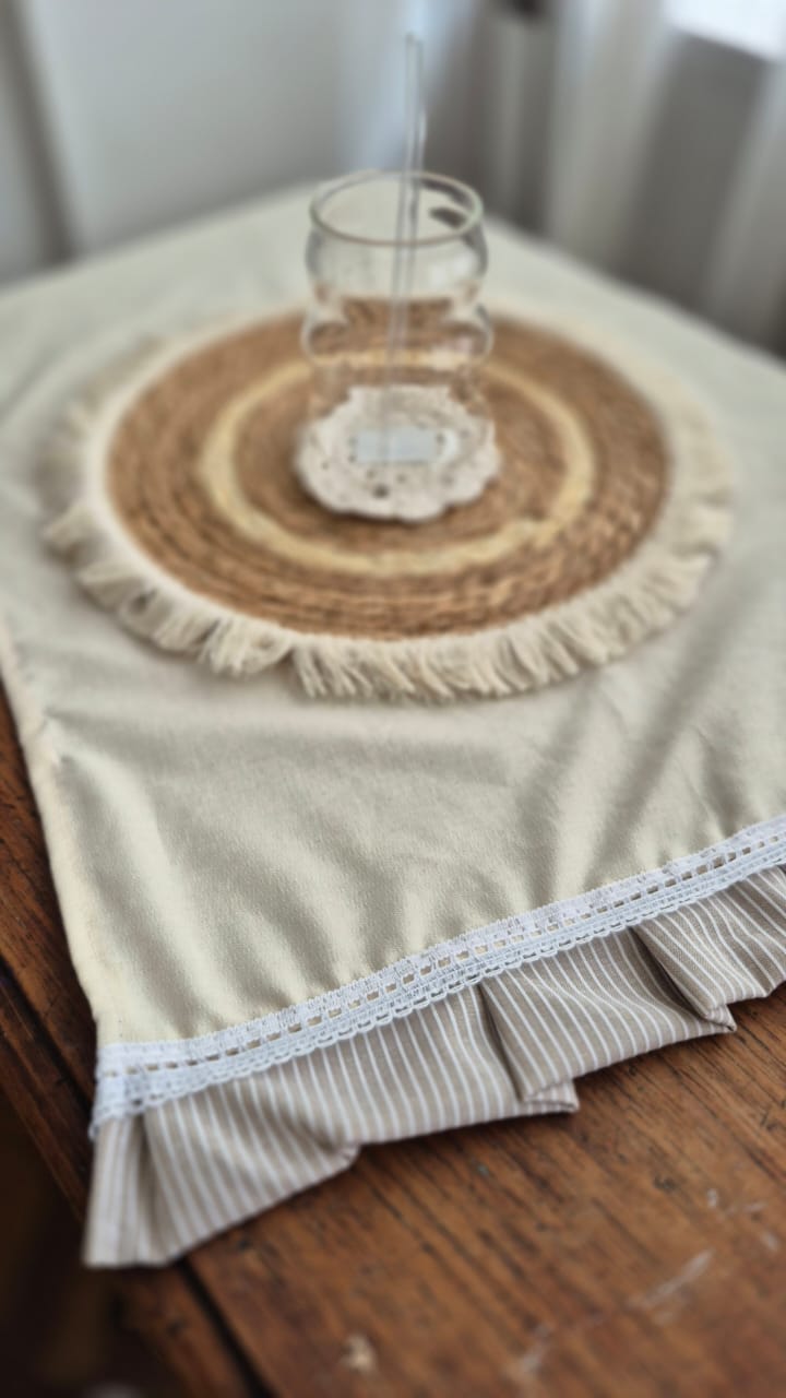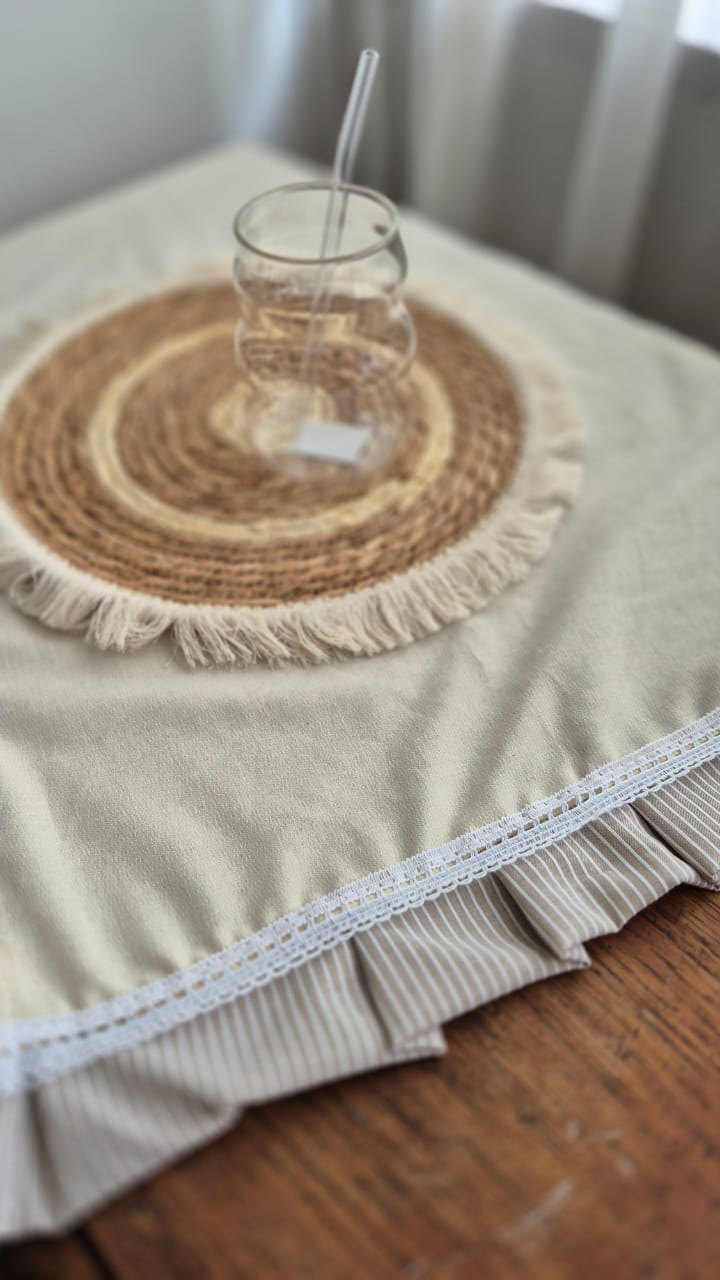 Confeccionado en tela de algodón suave, este mantel combina practicidad y estilo gracias a sus delicados voladitos que le aportan un toque romántico y boho.
